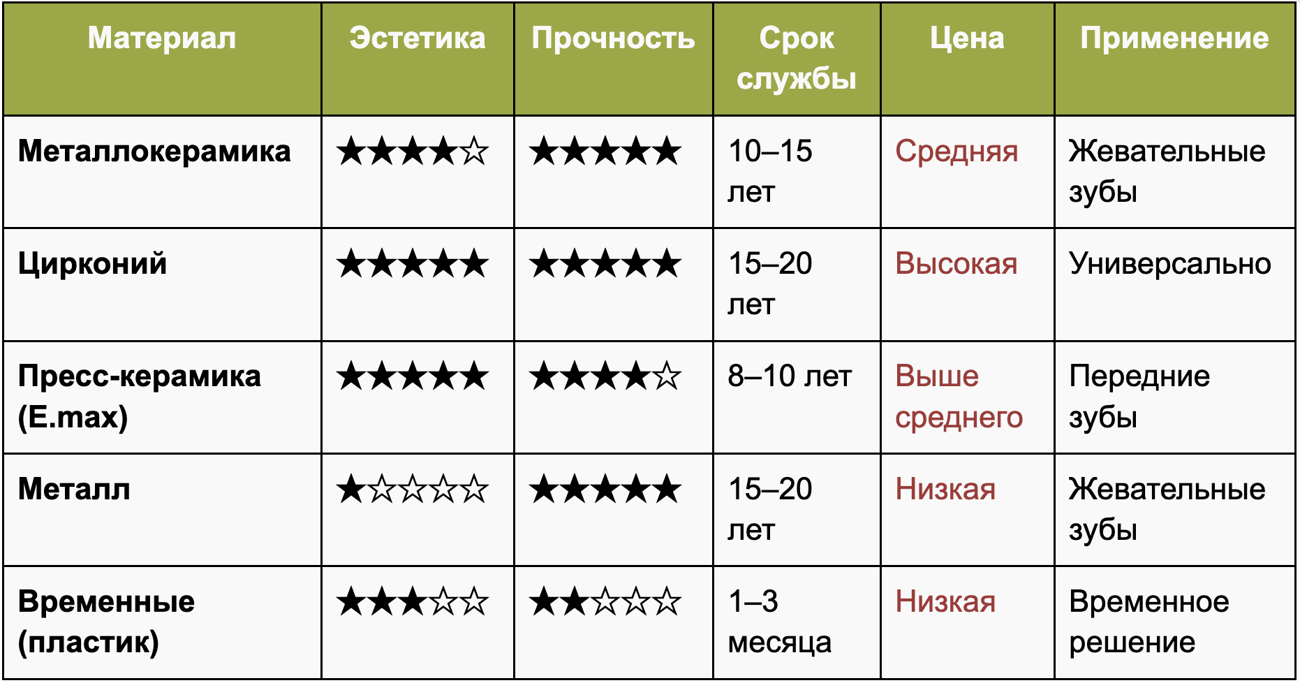 Цирконий часто выбирают для передних зубов — он выглядит как «живой» и не отличим от натуральной эмали. Подробнее об отличиях — в статье Циркониевые или металлокерамические коронки.