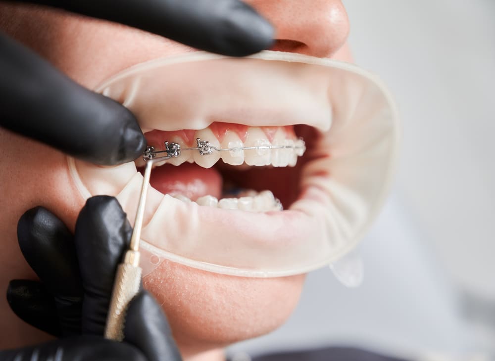 Затем фиксируют брекеты на зубах. Первые месяцы происходит выравнивание зубных рядов — устранение скученности и поворотов. Следующий этап — коррекция прикуса, когда врач активно работает над соотношением челюстей с помощью специальных дуг и эластиков.